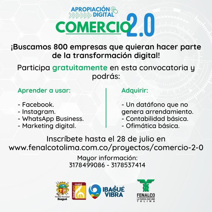 Con una inversión de $230 millones de pesos, la Administración Municipal en convenio con Fenalco Tolima, vienen adelantando una convocatoria denominada Comercio 2.0 dirigida a los empresarios de la ciudad de Ibagué que sedeen transformar su negocio al mundo digital.