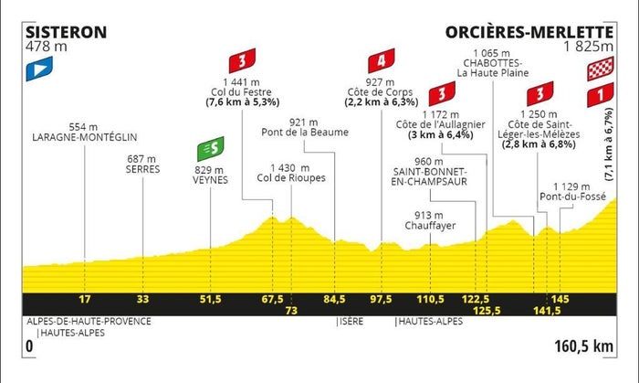- La llegada en alto, el premio de montaña de 1ra categoría, en la estación de esquí alpino Orcieres-Merlette de 7,1 Km a 6,7 %.