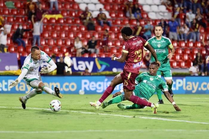 El partido mejoró después de media hora de iniciado, el comienzo fue de poca profundidad y cero remate, pero en el último cuarto de hora se desniveló a favor del conjunto pijao, que por intermedio de Daniel Moreno produjo el primer remate que puso a trabajar al arquero de la visita, después fueron tres minutos de sucesivos remates y llegadas por parte del conjunto pijao que pusieron en serio riesgo el arco asegurador.