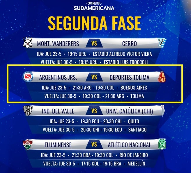 Los de Ibagué harán su debut en el certamen el próximo jueves 23 de mayo a las 7:30 pm (Hora colombiana) en el estadio Diego Armando Maradona de Buenos Aires ante Argentinos Juniors.