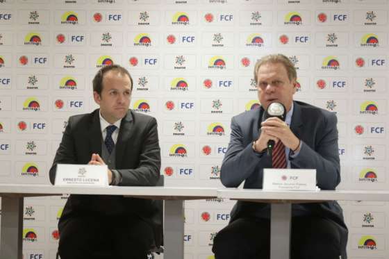 Junto a Ramón Jesurún, presidente de la Federación Colombiana de Fútbol, el máximo dirigente del deporte nacional hizo el anuncio del convenio, en el que también participa la División Mayor del Fútbol Colombiano, Dimayor.