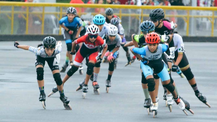 El patinaje de velocidad se realiza con patines en línea y los competidores realizan vueltas a una pista ovalada con el objetivo de llegar a la meta en el menor tiempo posible.