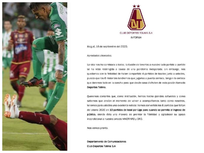 Deportes Tolima emitió comunicado sobre la situación de positivos por Covid 19, en 20 de sus integrantes, lo que ha obligado a postergar su juego ante Atlético Nacional y de igual manera pendiente ante América de Cali.