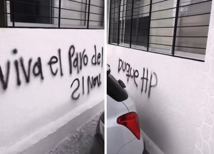 Según se pudo observar lo que escribió el desadaptado fue “Viva el Paro del 21 nov” y “Duque HP” en claro mensaje en contra del primer mandatario de la nación.