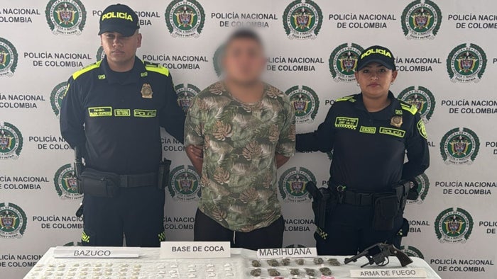 Al practicarle un registro, los policías hallaron en su poder 22,3 gramos de bazuco, 12,4 gramos de cocaína, 100,6 gramos de marihuana y un revólver calibre 38 con seis cartuchos, sin permiso para porte o tenencia.