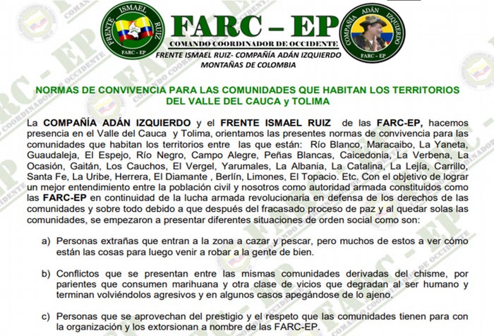 Hacemos presencia en el Valle del Cauca y Tolima, orientamos las presentes normas de convivencia para las comunidades que habitan los territorios entre las que están: Río Blanco, Maracaibo, La Yaneta, Guaudaleja, El Espejo, Río Negro, Campo Alegre, Peñas Blancas, Caicedonia, La Verbena, La Ocasión, Gaitán, Los Cauchos, El Vergel, Yarumales, La Albania, La Catalina, La Lejía, Carrillo, Santa Fe, La Uribe, Herrera, El Diamante, Berlín, Limones, El Topacio. Etc. Con el objetivo de lograr un mejor entendimiento entre la población civil y nosotros como autoridad armada constituidos como las FARC-EP en continuidad de la lucha armada revolucionaria en defensa de los derechos de las comunidades y sobre todo debido a que después del fracasado proceso de paz y al quedar solas las comunidades, se empezaron a presentar diferentes situaciones de orden social como son: