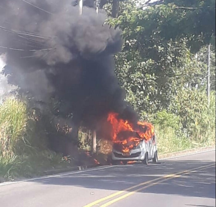 La emergencia vehicular se presentó en el sector de la vereda Berlín ubicada entre la glorieta de Mirolindo y el puente de la variante, donde los ocupantes de un automóvil particular tuvieron que descender rápidamente al escuchar una explosión en la parte delantera del vehículo.
