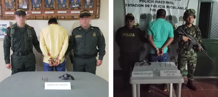 En las últimas horas se presentaron dos capturas en el territorio tolimenses, donde en Falan y Rioblanco fueron sorprendidos en flagrancia por las autoridades portando armas de fuego, las cuales no presentaban la documentación necesaria para su porte.