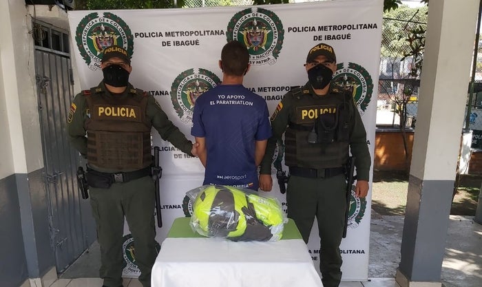 La particular situación se presentó en la Carrera 3ra con calle 86 del barrio Jardín Parte Alta, punto donde unidades Policía Metropolitana de Ibagué, adelantaron la captura de un individuo de 25 años, el cual iba a bordo de una motocicleta particular e iba vestido con una chaqueta reflectiva con logos de la Policía Nacional y un casco del mismo color.