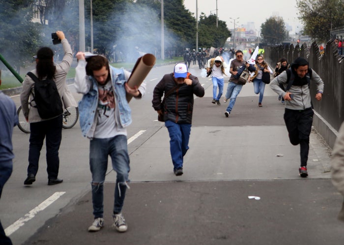 Varios estudiantes escapan de las bombas de aturdimiento del ESMAD