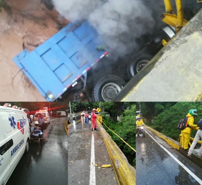 La situación fue reportada hace algunos minutos en el puente de ingreso al corregimiento de Gualanday, donde el conductor de un vehículo de carga pesada tipo volqueta doble troque perdió el control, luego que al parecer se quedará sin frenos, al descender por las peligrosas curvas que unen al peaje con esa población. Le sugerimos leer: Leridenses marchan en contra de la privatización del alumbrado público Fue así que al tomar el último giro para llegar al puente, el chofer identificado como Carlos Andrés Ortiz Perdomo intentó frenar, pero infortunadamente el vehículo de placas WGV-707 no respondió, de tal forma que se estrelló contra las barandas metálicas de seguridad hasta caer a la parte baja de la estructura en la ribera del afluente que por allí transita. Producto del fuerte impacto la volqueta empezó a incendiarse, requiriendo la presencia de los Bomberos del municipio de Espinal y el corregimiento de Chicoral. Le sugerimos leer: Vía Palocabildo – San Jerónimo será intervenida por la administración departamentalLe sugerimos leer: Santos resalta la importancia de la Alianza del Pacifico para Colombia y la región Por su parte, los paramédicos de una ambulancia que transitaba en por el sector se encargaron de auxiliar al conductor de 25 años, trasladándolo hasta las instalaciones de un centro asistencial donde a esta hora recibe atención médica por un posible fractura de extremidades inferiores. Le sugerimos leer: Gobernación convoca a sesiones extraordinarias de la Asamblea del TolimaLe sugerimos leer: Vargas Lleras presentó su libro en la “Feria del Libro de Bogotá” Por ahora las autoridades intentan determinar la mejor manera de retirar el pesado vehículo que permanece volcado lateralmente, en la parte baja de la estructura metálica. También le puede interesar: