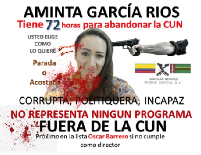 La persona amenazada es Aminta García Ríos, directora del programa de ciencias de la comunicación de la Corporación Unificada Nacional de Estudios Superior – CUN, la cual se dirigió ante las autoridades judiciales para hacer conocer una serie de amenazas de muerte de las cuales ha sido víctima en los últimos meses, tiempo en el que ha recibido mensajes intimidantes y panfletos a su correo electrónico.