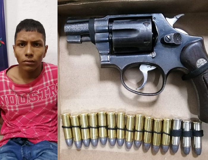 Al momento en que patrulleros detuvieron el vehículo, al pasajero de 20 años de edad le encontraron un arma de fuego marca scorpion con 16 cartuchos calibre 38.