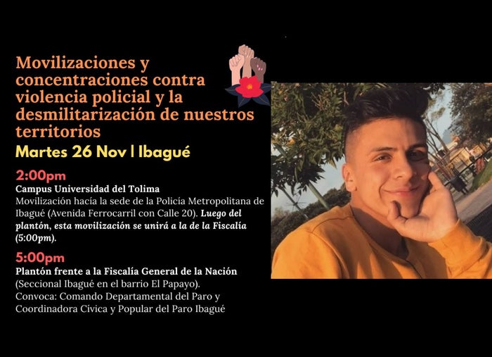 En Ibagué las concentraciones se realizarán sobre las 02:00 de la tarde, partiendo desde la Universidad del Tolima, subiendo por la avenida Ferrocarril y reuniéndose frente a las instalaciones de la Policía Metropolitana de Ibagué, lugar donde se realizará un plantón donde se alzará la voz pidiendo justicia por Dilan Cruz.