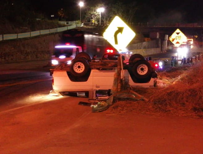 Según las primeras informaciones, un carro tipo campero, de color blanco y placas GQA 575, se quedó sin frenos y sufrió volcamiento lateral, quedando llantas arriba a un lado de la cartera.
