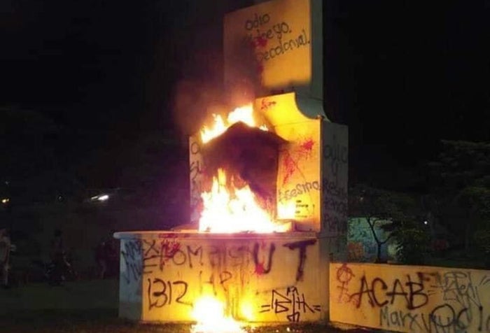 Pese a que las autoridades llevaron a cabo mesas de diálogo con colectivos de derechos humanos para concertar las actividades a desarrollarse durante el Día de la Resistencia Indígena, se reportaron actos de vandalismo al monumento del fundador de Ibagué, Andrés López de Galarza.