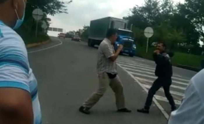Esta vez dos hombres protagonizaron una riña entre un conductor de servicio de taxi, y un motociclista, en donde ‘a mano limpia’ se agarran a golpes mientras son grabados por sus compañeros quienes dejan que estas dos personas se agredan hasta llegar al punto de tener que separarlos.