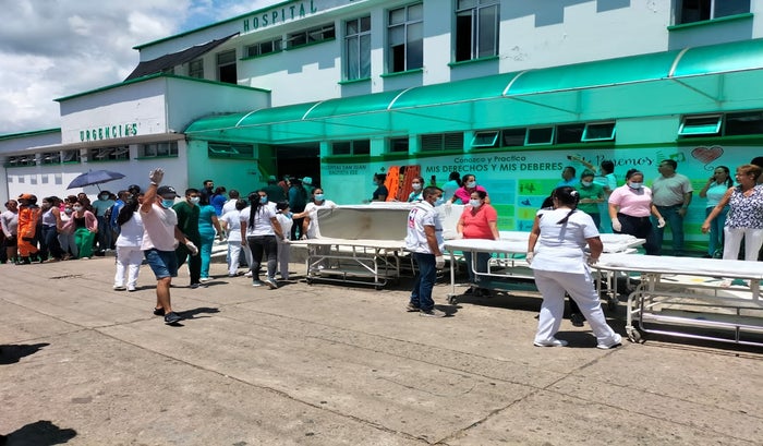 Son más de 200 personas que se encuentran a las afueras del hospital San Juan Bautista del municipio con cintas para ayudar a dar paso al personal y a los vehículos que traen heridos para que puedan ingresar fácilmente.