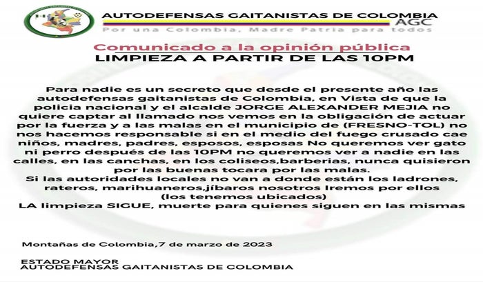 En diálogo con La Cariñosa 1.420 AM Ibagué, el secretario del Interior Departamental, Javier Triana manifestó, "Ayer conocimos este panfleto que empezó a rodar a través del Whatsapp, intimidado a nombre de las Autodefensas Gaitanistas de Colombia, por lo que pusimos esto en conocimiento de las autoridades de inteligencia y ya podemos garantizar que primero nosotros en el departamento no tenemos presencia de este grupo armado y segundo, que este documento estaba compuesto por imágenes, logos y frases que se pudieron sacar de internet, con el fin de intimidar y desestabilizar a la comunidad".