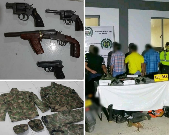 Estos individuos fueron descubiertos por unidades de la Seccional de Tránsito y Transporte de la Policía Metropolitana de Ibagué, quienes materializaron la captura en flagrancia de cuatro personas en el kilómetro 8 más 800 metros de la vía Ibagué – Mariquita luego de descubrirles en su poder una gran cantidad de elementos bélicos.