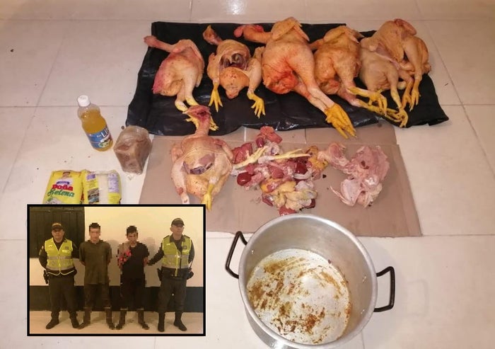El personal policial procedió a requisar a los sospechosos, encontrándole en su poder 6 gallinas, 1 olla, 2 libras de arroz, 1 frasco de aceite, 1 panela y 1 bolsa de leche en polvo.
