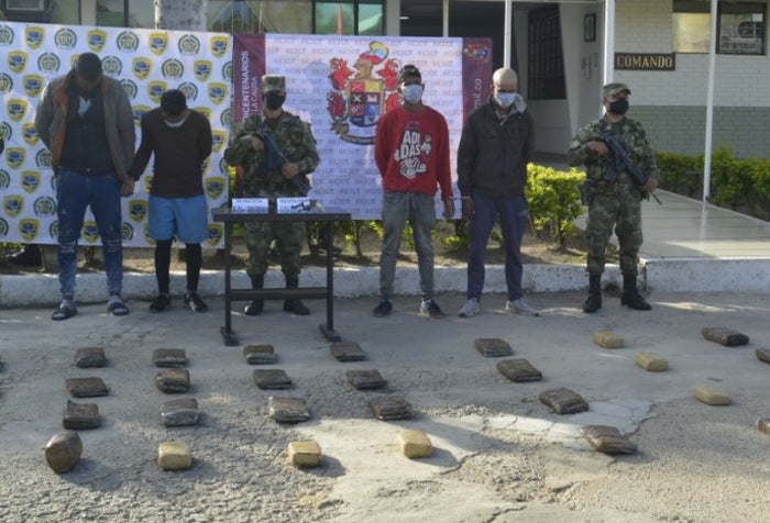 Los hombres identificados como Gregorio Flórez Carmelo, Manuel Carlos Aular Leal, Jesús Enrique Quintero Gómez y Yendis Joselismer Castillo Rosales, transportaban en bolsos negros, un total de 34 paquetes forrados en plástico negro que resultaron contener marihuana y un arma de fuego calibre 32 así como tres cartuchos 7.65 milímetros, elementos que condujeron a la captura por tráfico, fabricación y porte de estupefacientes y de armas de fuego y munición.