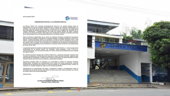 La Clínica Tolima S.A. lamenta profundamente informar a la opinión pública sobre el fallecimiento de una de nuestras pacientes tras su egreso de nuestras instalaciones. La paciente, una mujer de 54 años, ingresó a nuestro servicio de urgencias con diagnóstico de enfermedad en estado terminal. Desde el momento de su llegada fue atendida con la máxima dedicación y profesionalismo por parte de nuestro equipo de salud, quienes brindaron una atención integral, adecuada a sus condiciones médicas y al estado avanzado de su enfermedad como se encuentra descrito en la historia clínica.