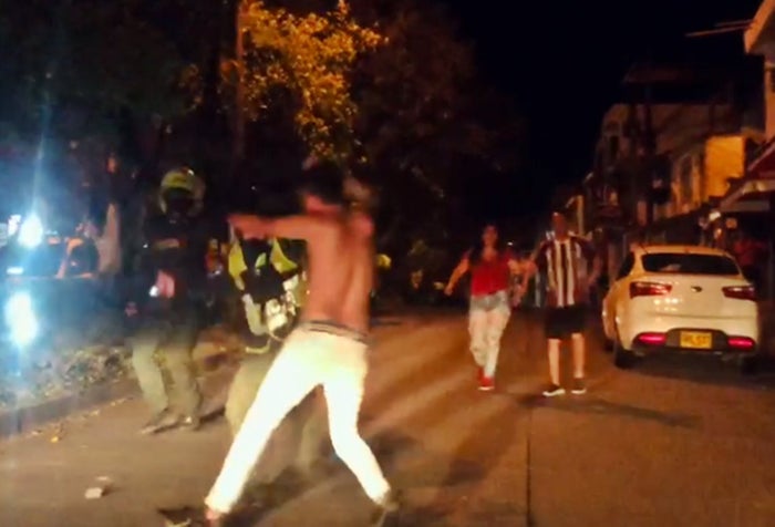 De un momento a otro, uno de los policiales se abalanzó contra ‘el borracho’ haciéndolo caer para lograr reducirlo, lo curioso es que ya estando boca abajo y en el piso, un uniformado siguió ‘encarnizado’ dándole por la espalda con la tonfa, situación violenta que hasta la comunidad tuvo que intervenir para pedirle que no lo agrediera más.