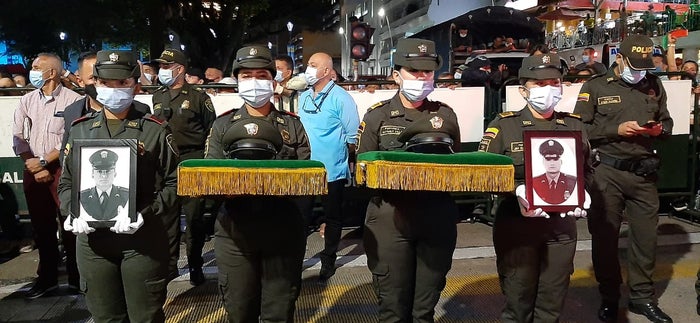 En la Catedral de Ibagué, ubicada en el centro de la ciudad, se cumplieron este martes las exequias de los patrulleros de la Policía Wilmar Alfonso Guzmán Martínez, de 36 años, y José Alejandro Goyes Aguilera, de 25, quienes fueron asesinados el pasado sábado por disidencias de las Farc, en el municipio de Santander de Quilichao, en el departamento del Cauca.