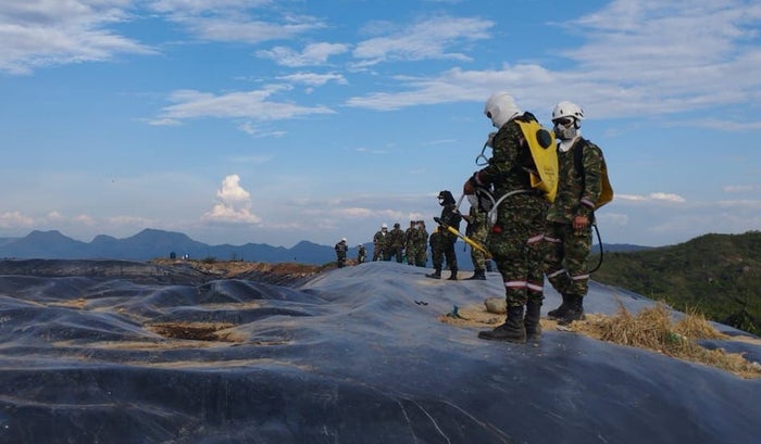 La Alcaldía de Ibagué junto al Cuerpo Oficial de Bomberos, continúan haciéndole frente a la emergencia registrada en el relleno sanitario La Miel, misma que ha sido controlada en un 90 % a través de un trabajo sin descanso, al que se ha sumado el Ejército Nacional con un contingente de 33 soldados de Biade.
