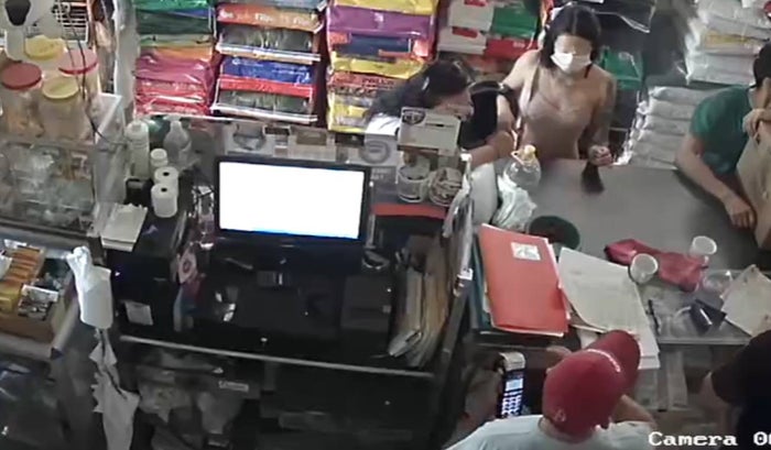 Una de las mujeres se da cuenta de que el celular está cerca de la caja registradora y le señala a la otra, dándole la indicación, mientras una de ellas se sitúa donde está una jaula de pollitos, haciendo que los esté viendo, según lo registrado en las cámaras del lugar.