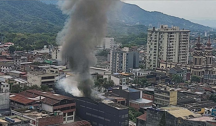 Sin personas lesionadas, Bomberos Oficiales y Bomberos Voluntarios trabajan en conjunto para y controlan el incendio estructural que se presenta en estos momentos en la Carrera Quinta entre 16 y 17 carril bajando, en el tercer piso del almacén de artículos para modistería La Reina.