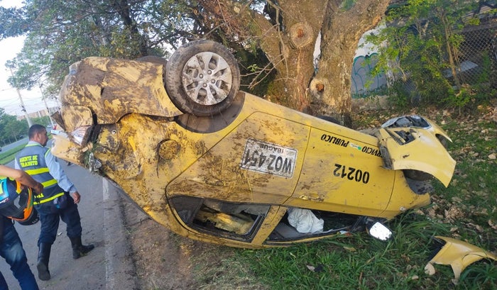 El siniestro vial con personas lesionadas se registró en horas de la tarde de este lunes 4 de septiembre de 2023, donde un taxi resultó con volcamiento total en la vía que conduce del Parque Deportivo al Aeropuerto Perales, en inmediaciones de la Clínica Medicadiz.