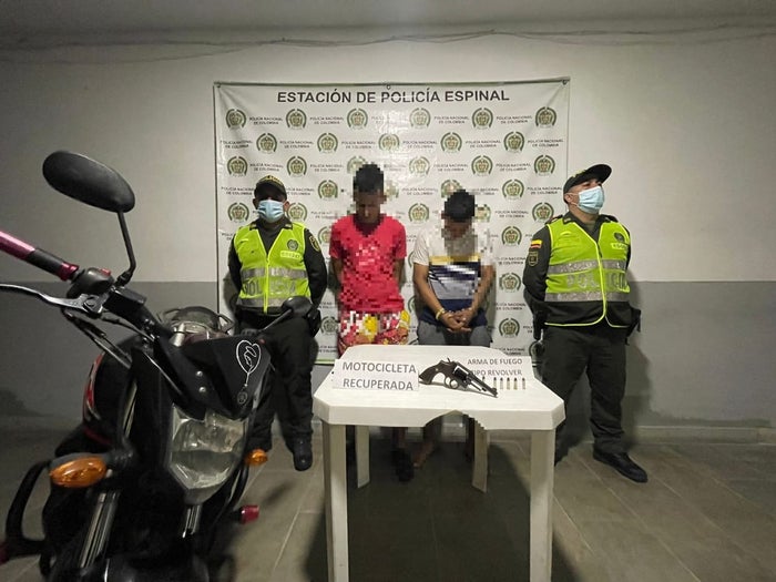Gracias a la información oportuna de la comunidad y la rápida acción de la Policía Tolima se desarrolló un plan candado en donde como resultado se logró la incautación de un revolver tipo 38 con munición y la captura de estos dos hombres de 22 y 24 años recuperando una motocicleta que habría sido robada en el sector de la glorieta mientras se movilizaban por el sector del barrio libertador en horas de la noche del municipio del Espinal.
