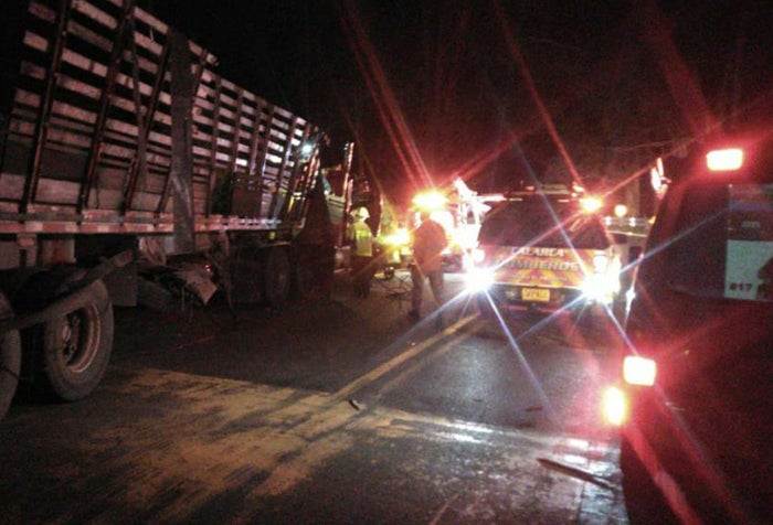 Allí se vieron involucrados tres vehículos, un particular, un tractocamión y una Turbo, resultando tres personas lesionadas, entre ellas, el conductor del tractocamión que quedó atrapado en la cabina, siendo rescatado por personal de emergencias de Calarcá, en el Quindío.