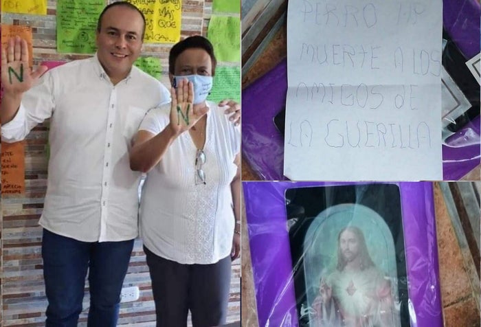 “Bajé a la sala y encontré el sufragio donde amenazan a mi esposo, hablamos con nuestros abogados, las autoridades y hoy decidimos hacer pública la noticia sobre esta amenaza. Esto nos está afectando a la familia y ahora lo quieren incriminar que él está con grupos al margen de la ley”, dijo a La Cariñosa Cristina Castaño, esposa del mandatario local.