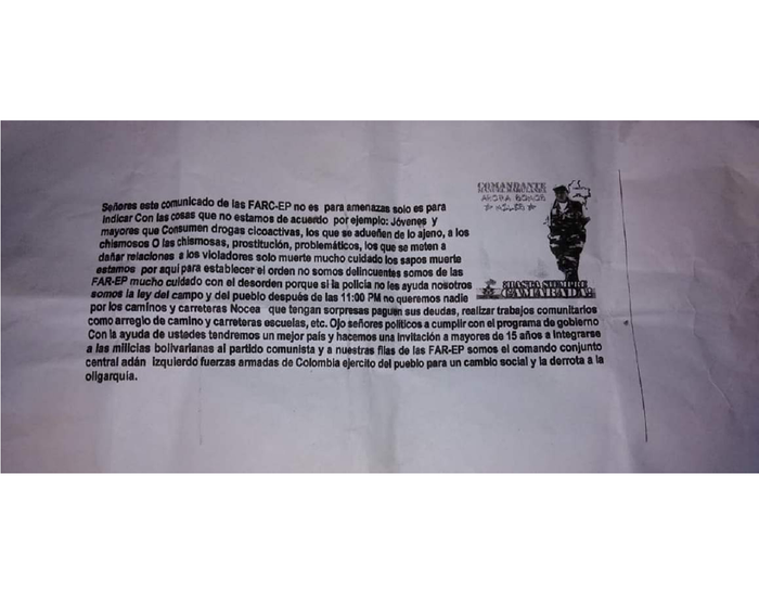 Desde el pasado fin de semana han circulado por el área campesina y urbana del municipio de Venadillo un panfleto amenazante, supuestamente firmado por miembros de las FARC-EP, el cual ha generado zozobra en los habitantes de este municipio del norte del Tolima.