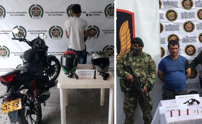 Cuando los miembros de la fuerza pública hicieron su arribo identificaron al sospechoso, un hombre de 40 años conocido como ‘El Soldado’, a quien al momento de realizar registro e identificación a persona, se le encontró un arma traumática tipo pistola, color negra, con un proveedor y cinco cartuchos para pistola 9 milímetros, así mismo la motocicleta, avaluada en $3.500.000, donde se movilizaba un segundo sujeto que al notar la presencia Policial emprende la huida arrojando un arma de fuego tipo revolver, color negro, avaluado en $ 1.000.000.