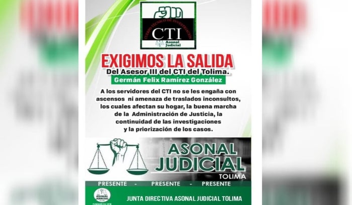 “El CTI no está solo, unidos hacemos la fuerza, perdamos el miedo a denunciar el acoso laboral y los traslados inconsultos. Si te sientes afectad@, cuéntanos tu caso, te ofrecemos asesoría y acompañamiento legal gratuito durante todo el proceso. Denuncia compañero, no te quedes callado, recuerda que al capataz lo cambian y queda con el desprestigio del maltrato al servidor. Líneas de atención Asonal Judicial Tolima, para los compañeros por acoso laboral 3209146486 - 3194867124 – 3154802373. Fuera Germán Ramírez del CTI”, finalizó Rojas Oviedo.