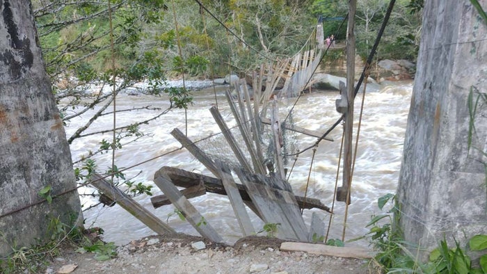 En un lamentable accidente ocurrido en un sector conocido como El Cambrín, zona limítrofe entre los municipios de Ataco y Rioblanco, en el sur del Tolima, un campero con ocho personas a bordo cayó a las caudalosas aguas del rio Saldaña tras el colapso del puente por donde se pasa de un municipio a otro.