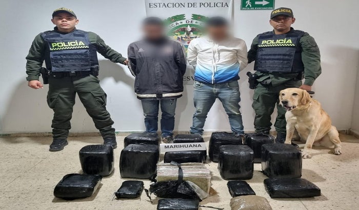 Dos individuos, de 40 y 49 años, oriundos del departamento del Cauca, fueron capturados en flagrancia mientras se desplazaban en dos motocicletas. Gracias al eficiente trabajo del canino especialista en detección de sustancias ilícitas, denominado ‘Iván’, se logró detectar 16 paquetes de marihuana ocultos en dos maletas de viaje, con un peso total de 64 kilogramos y un valor estimado en cerca de los $70.000.000.