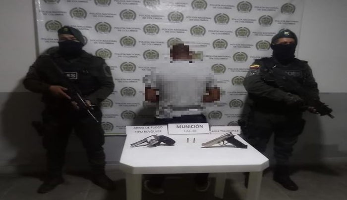 De esta manera los uniformados logran la captura en flagrancia de un hombre el cual, al momento de realizarle registro a persona, actividad que se propuso las autoridades a realizar diariamente, se le halló en su poder un arma de fuego tipo revólver, calibre 38 milímetros con 2 cartuchos al el que se le da un valor cerca de 3 millones de pesos, sin permiso para porte o tenencia, así mismo 1 arma traumática tipo pistola calibre 9 milímetros, color negro con 4 cartuchos.