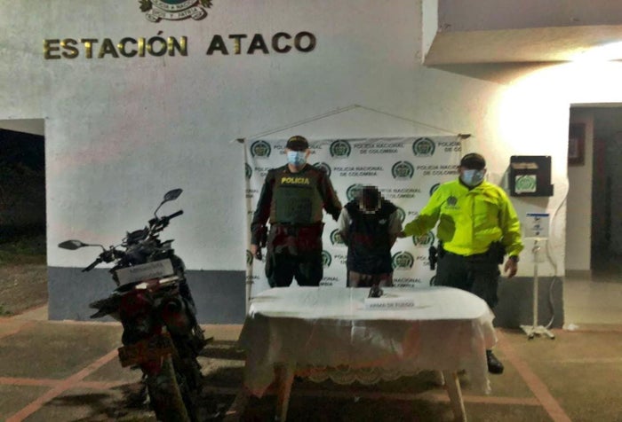 Según las autoridades, "En desarrollo a la estrategia integral contra el hurto en todas sus modalidades y el porte ilegal de armas de fuego, en las últimas horas gracias a la rápida reacción y articulación de las estaciones de Policía Ataco y Santiago Pérez, se logra captura de un sujeto, la inmovilización de una motocicleta y la incautación de un arma de fuego".