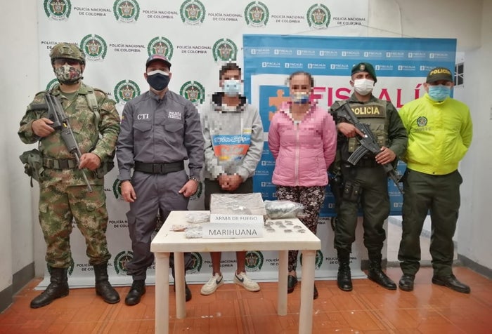 “Es así como en las últimas horas se inicia un operativo en coordinación con la Fiscalía 36 unidad seccional de Fresno, en dos residencias ubicadas en los barrios La Cruz y Estadio, se realizó diligencias de allanamiento y registro, logrando la captura en flagrancia de estas personas a quienes se le halló en la residencia cerca de 1 libra de marihuana más de 70 dosis de bazuco $130.000 en dinero en efectivo, así mismo un arma de fuego tipo revolver calibre 38 con 6 cartuchos para el mismo y cartuchos, sin permiso para porte o tenencia”, dijo el alto oficial.
