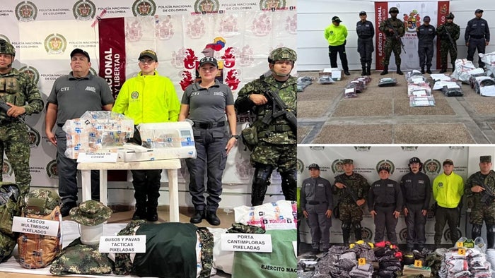 Por medio de órdenes de allanamiento en 15 establecimientos se logra la incautación de armas de fuego y municiones, presillas, reatas, cartucheras verdes, camisetas pixeladas, cantimploras, colchonetas, espada de la victoria, botones del uniforme del Ejército Nacional, mancuernas, grados del Ejército, parches y escudos del Ejército, prendas militares, pavas, Protectores para gafas, Protectores para cascos, Memorias usb, Rollo de tela camaleón, Máquinas bordadoras familiares, talonarios de facturas, cuaderno de anotaciones, celulares, máquina bordeadora, rollo de tela lycrado tipo pixelado, todos estos elementos no contaban con el permiso requerido de acuerdo al artículo 19 del decreto 180 de 1998, correspondiente a Importar, fabricar, transportar, almacenar, distribuir, comprar, vender, suministrar, sustraer, portar o utilizar prendas, textiles empleados para la fabricación de uniformes de campaña, insignias o medios de identificación, de uso privativo de la fuerza pública o de los organismos de Seguridad del Estado.