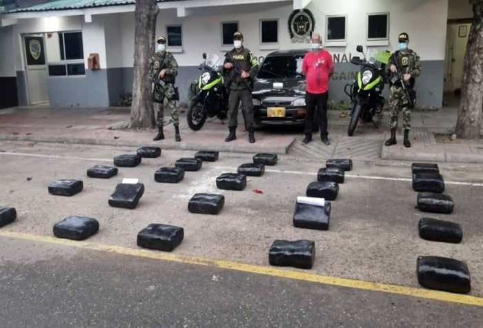 “Es así como de inmediato se activa un plan candado donde horas después sobre el kilómetro 105 vía Neiva – Castilla, corregimiento de Castilla del Municipio de Coyaima, se realiza señal de pare a un vehículo tipo automóvil con las características similares a la información, el cual era conducido por un sujeto de 50 años, a quien, al momento de realizarle registro e identificación a persona y vehículo, en la parte interna del automotor se le hallaron 25 paquetes de forma rectangular recubiertos en plástico color negro, los cuales en su interior contenían una sustancia vegetal que por sus características de color se asemejan a la marihuana tipo cripy equivalentes en un peso bruto de 129 kilos y peso neto de 129.635 kilogramos, representados en cerca de 320 mil dosis avaluados en cerca de $12.000.000, siendo capturados de inmediato”, indicó el capitán Arana.