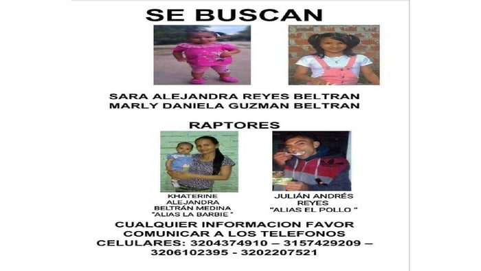 Desde el 20 de diciembre con la promesa de devolverlas a las 4 de la tarde, justo antes de que empezara la quinta novena que se rezaría en casa a las 6 de la tarde, al parecer fueron raptadas las niñas Sara y Daniela de 11 y 2 años de edad, por Katherine Mejía, quien sería su madre biológica y quien al parecer habría sacado a las niñas para no devolverlas a la casa de su abuela Blanca Beltrán la responsable legal de las menores y la encargada de cuidarlas.