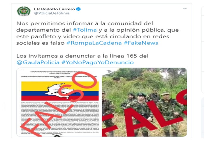 Teniendo en cuenta un vídeo y un panfleto alusivos al autodenominado grupo "Frente Tulio Barón" que ha venido circulando en las últimas horas a través de redes sociales o grupos de WhatsApp, en el cual se da a conocer la presencia activa de este grupo en el norte del Tolima, se logra establecer que son absolutamente falsos donde se invita a la comunidad a no caer en este tipo de engaños con los cuales se busca generar futuras extorsiones”, dijo.