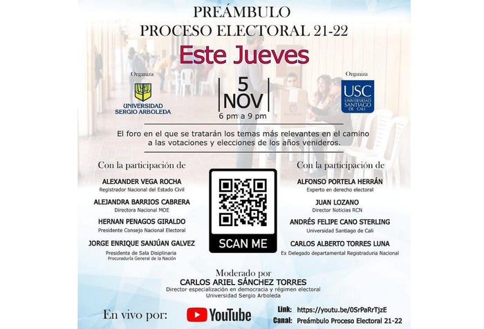 Según indicó el ex registrador, todas aquellas personas que deseen participar pueden ingresar a YouTube y buscar proceso electoral 21-22. Cabe resaltar que de este proceso harán parte Alexander Vera, Registrador Nacional del Estado Civil, Alfonso Portela, Experto en derecho electoral, Jorge Enrique Sanjúan, Presidente de la Sala Disciplinaria, Carlos Alberto Torres, Ex delegado Departamental de la Registraduría Nacional, entre otros.