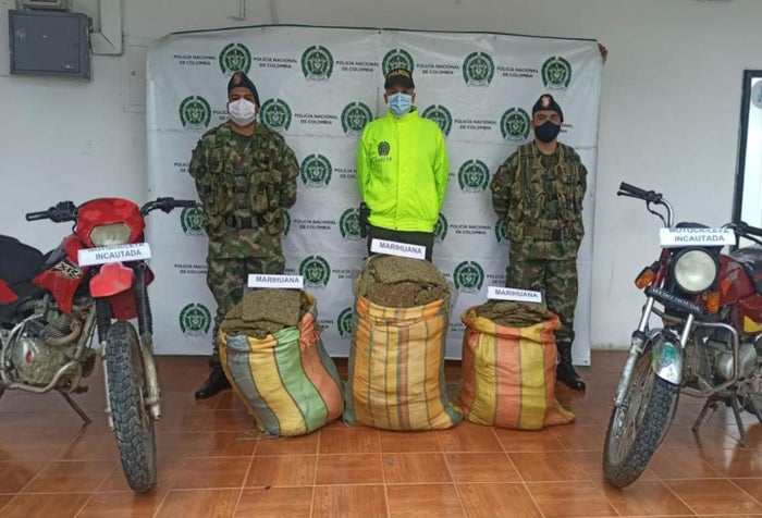 El oficial indicó que “El hecho se presentó en horas de la noche, donde gracias al trabajo articulado y tareas conjuntas mediante labores investigativas e información de inteligencia del Batallón de Operaciones Terrestres n. 18 Cozeu Sexta Brigada y la unidad básica de investigación criminal Sijin, sobre la vereda el venado zona rural del corregimiento de Herrera municipio de Rioblanco, se logra la incautación 111.550 kilogramos de marihuana tipo cripy representados en cerca de 260 mil dosis, avaluadas en cerca de $140.000.000 y la inmovilización de dos motocicletas de mediano cilindraje en las cuales dos sujetos se movilizaban quienes al notar la presencia del personal uniformado, emprenden la huida dejando abandonado la sustancia y los automotores”, dijo.